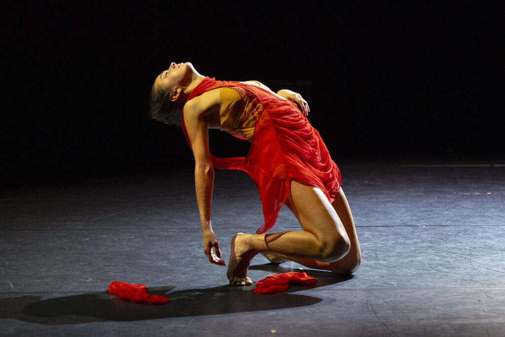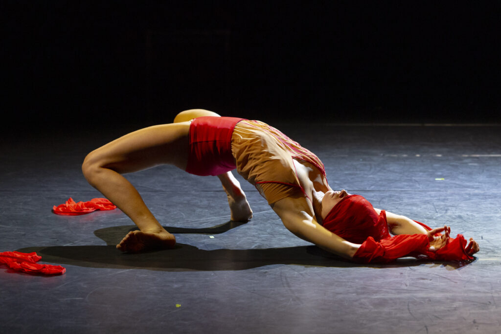 Au début, une ample corolle de fleur rouge en guise de costume enveloppe la partie haute de son corps, empêchant l’artiste de dévoiler ses désirs intimes.