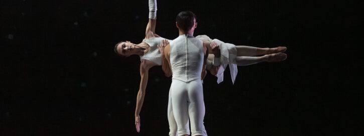 Le blanc des costumes des danseurs, par ailleurs adoptés aussi dans d’autres de ses oeuvres, notamment Line Up et Glacial Decoy, contraste et éclaire le ciel noir étoilé qui constitue le seul élément de décor. Les trois étoiles, Dorothée Gilbert, Marc Moreau et Guillaume Diop, alternent des duos et trios, leur plastique défiant les lois de la gravité. Leurs corps vainquent les notions de poids et d’effort, les portés sont suspendus dans l’air et exécutés parfaitement, en concevant des évolutions harmonieuses semblables à celles d’un oiseau. Mais cette référence animalière n’est pas fortuite.