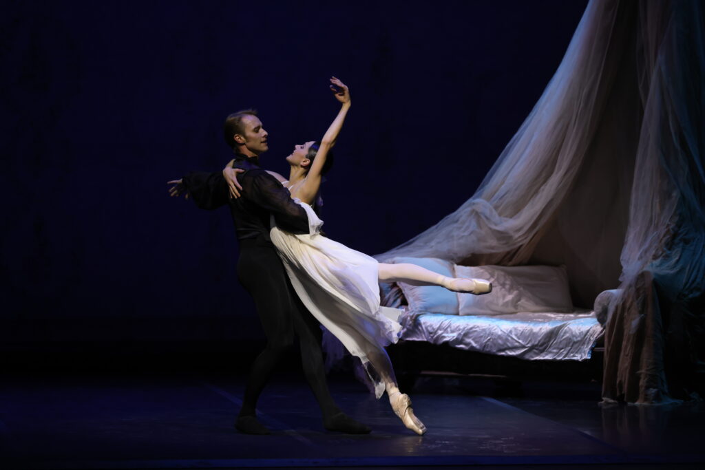 Pour la scène suivante, celle de la lettre extraite du ballet Onéguine de John Cranko, on se souvient de la précision mathématique qu’elle exige tout en suggérant l’émotion la plus vive, Cela semble aller de soi pour le couple (sur scène et dans la vie) Nicoletta Manni et Timofej Andrijashenko qui l’ont dansé très souvent ensemble. Manni possède le tempérament romantique de son personnage, Tatiana, et soigne les détails jusque dans sa façon de faire trembler la plume avec laquelle, pleine d’émotion, elle écrit à Onéguine.